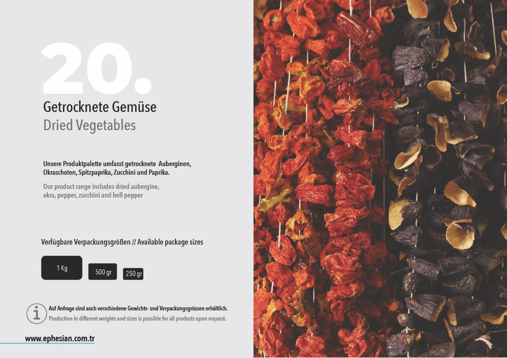 Our wide range of products varies from dried fruits and vegetables to fine canned goods, which are ripened under the Mediterranean sun in the fertile Anatolian soil and preserved with the utmost care in compliance with European standards. For our customers we offer only the best from our fields to their table all year round…
